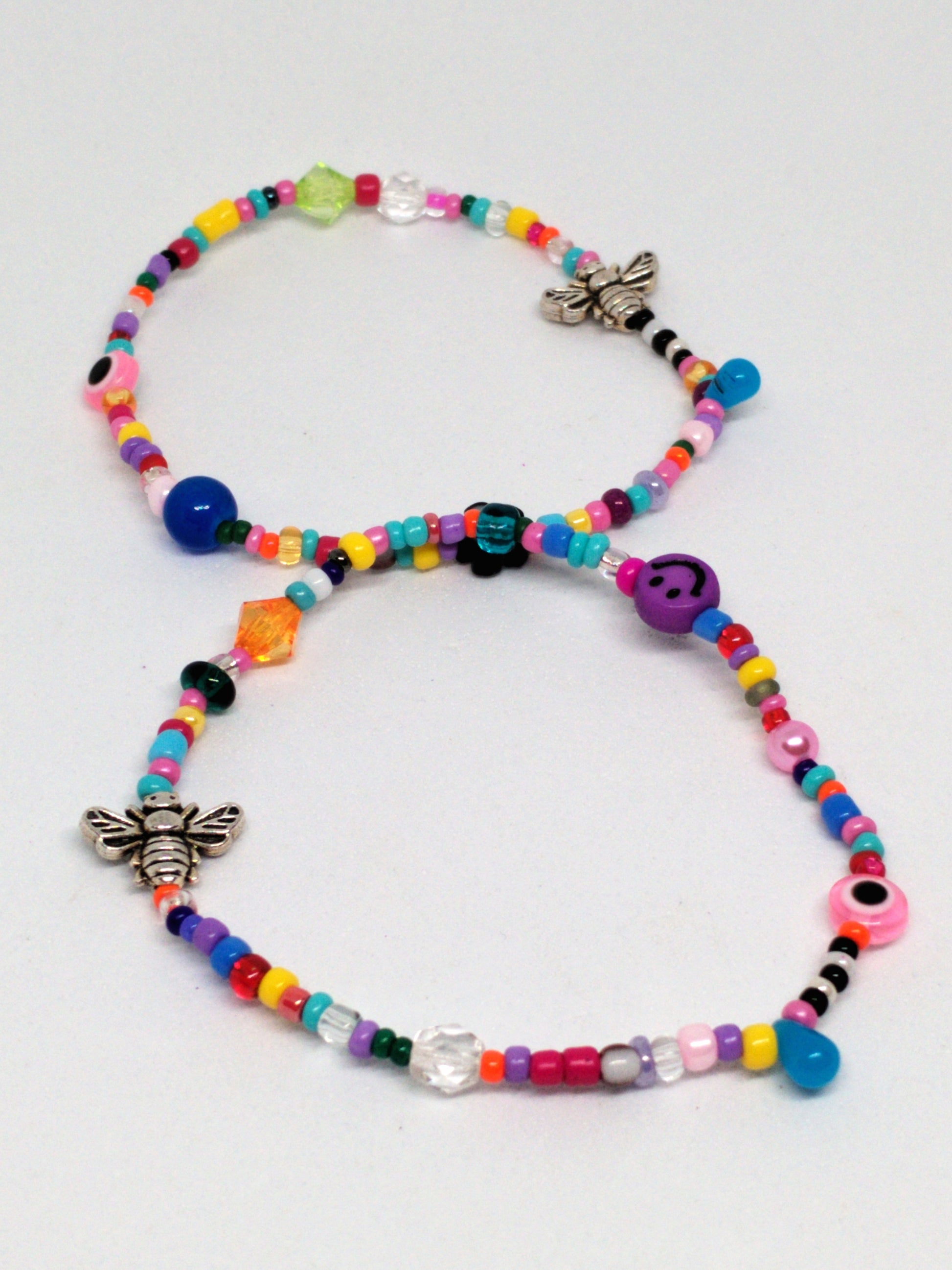 Bright colourful beaded bracelets with a silver bee bead charm. Bracelets are approximately 16/17cm. Each bracelet may differ from the photos.