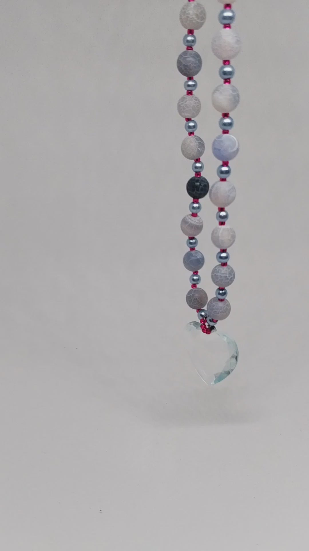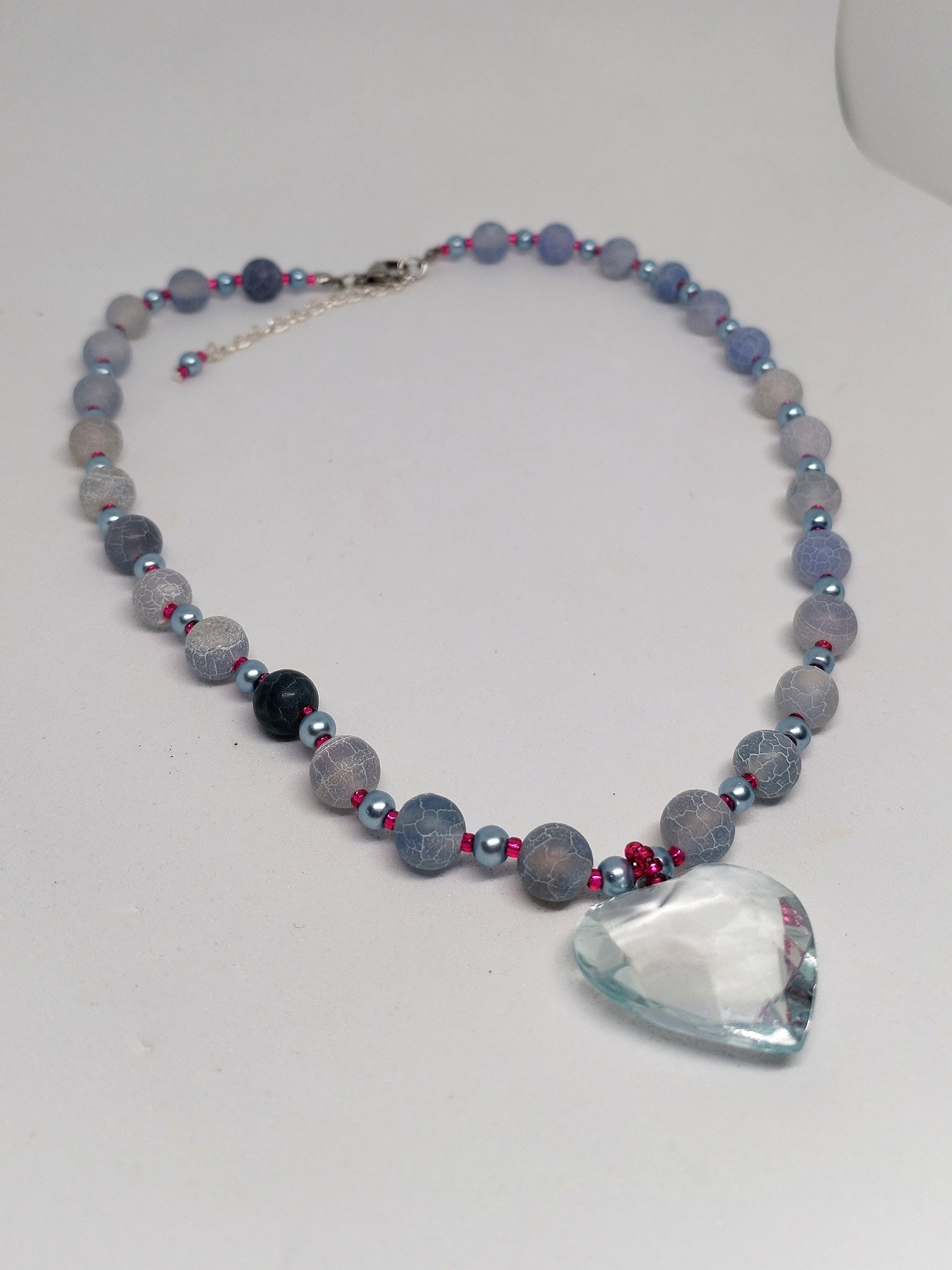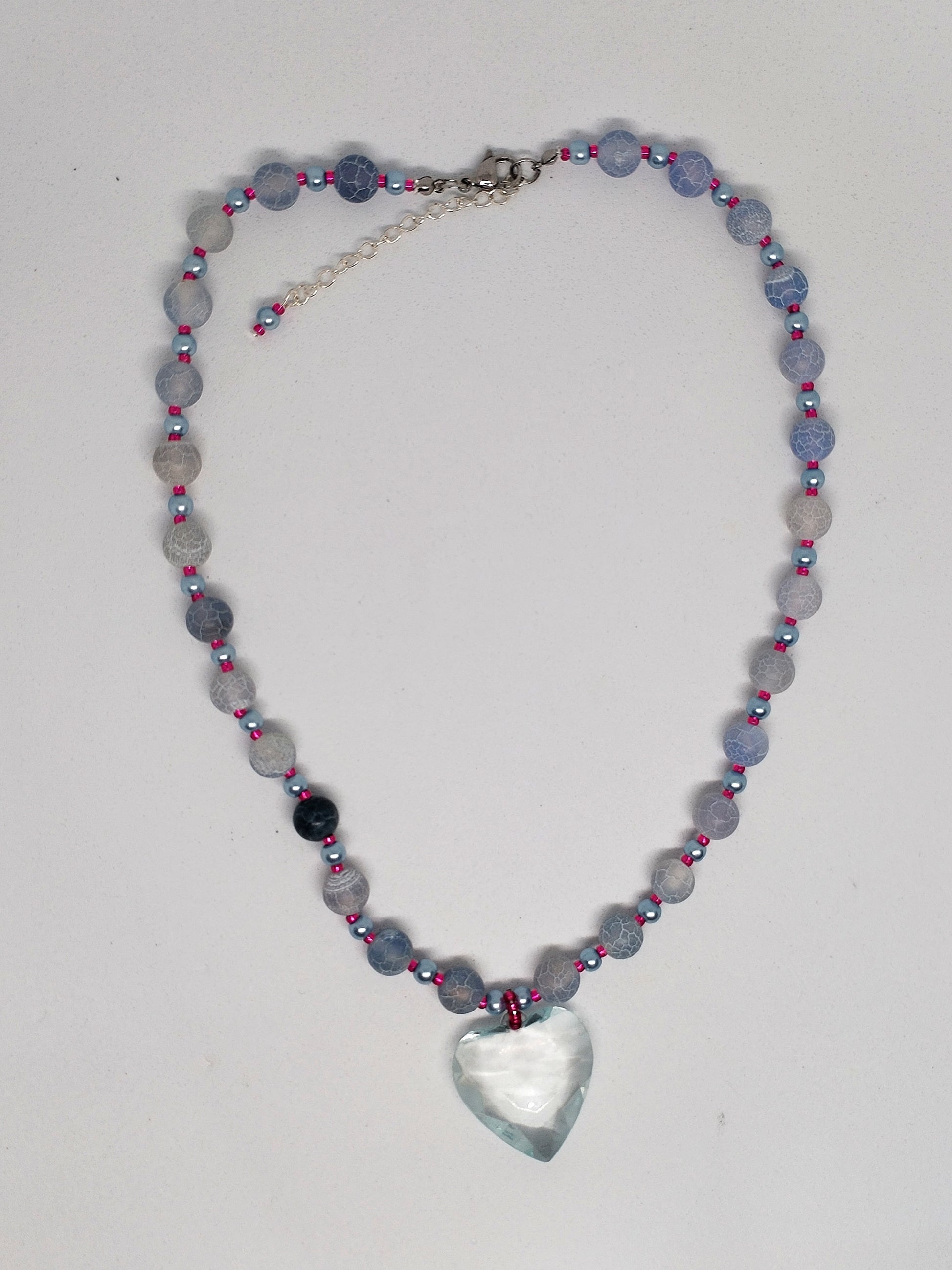 One of a kind handmade beaded necklace made using preloved light blue marbled beads with new pink seed beads & blue faux pearls. The heart pendant has a hint of blue & is faceted so catches the light.