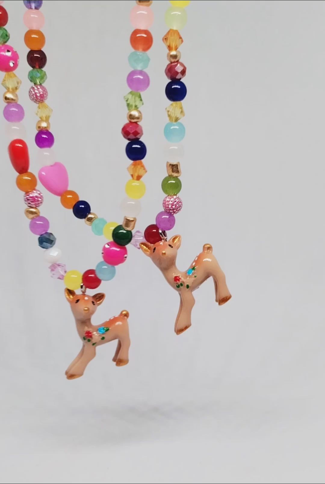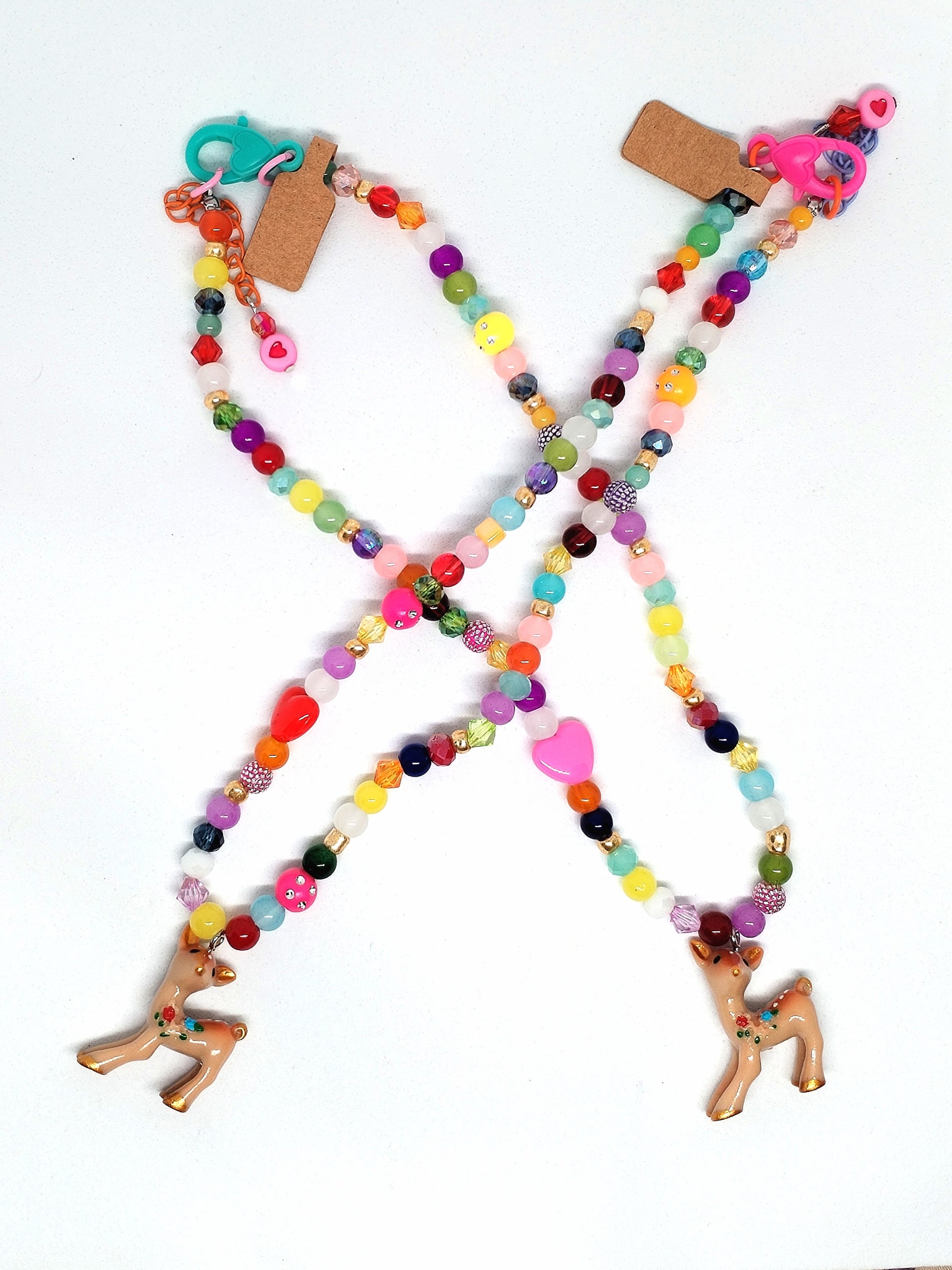 Stunning, colourful & unique handmade beaded necklace with cute little deer pendants. Each necklace is slightly different in colour & beads. Large coloured plastic lobster clasp & coloured extension chain.