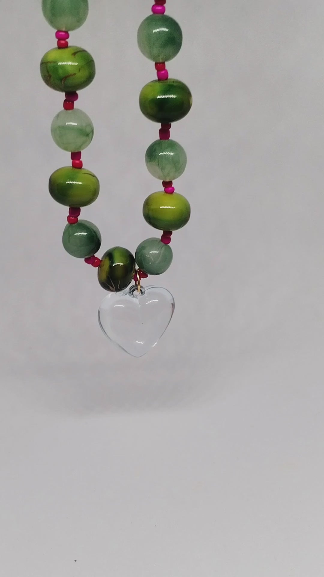 One of a kind handmade beaded necklace made using vintage green beads with pink seed beads with a preloved translucent heart pendant that has a hint of blue colour.