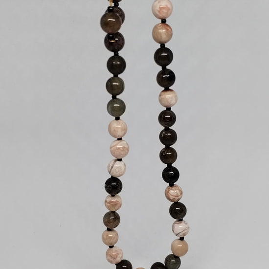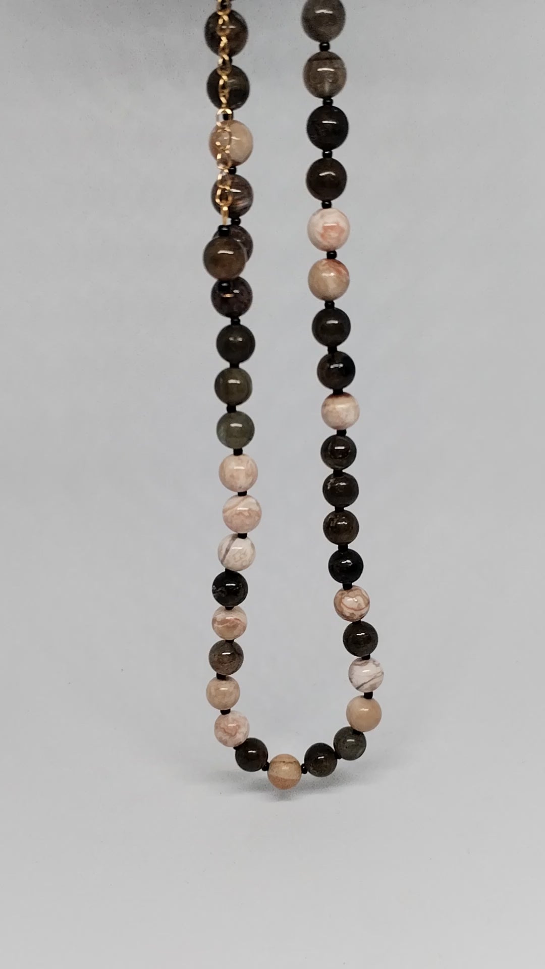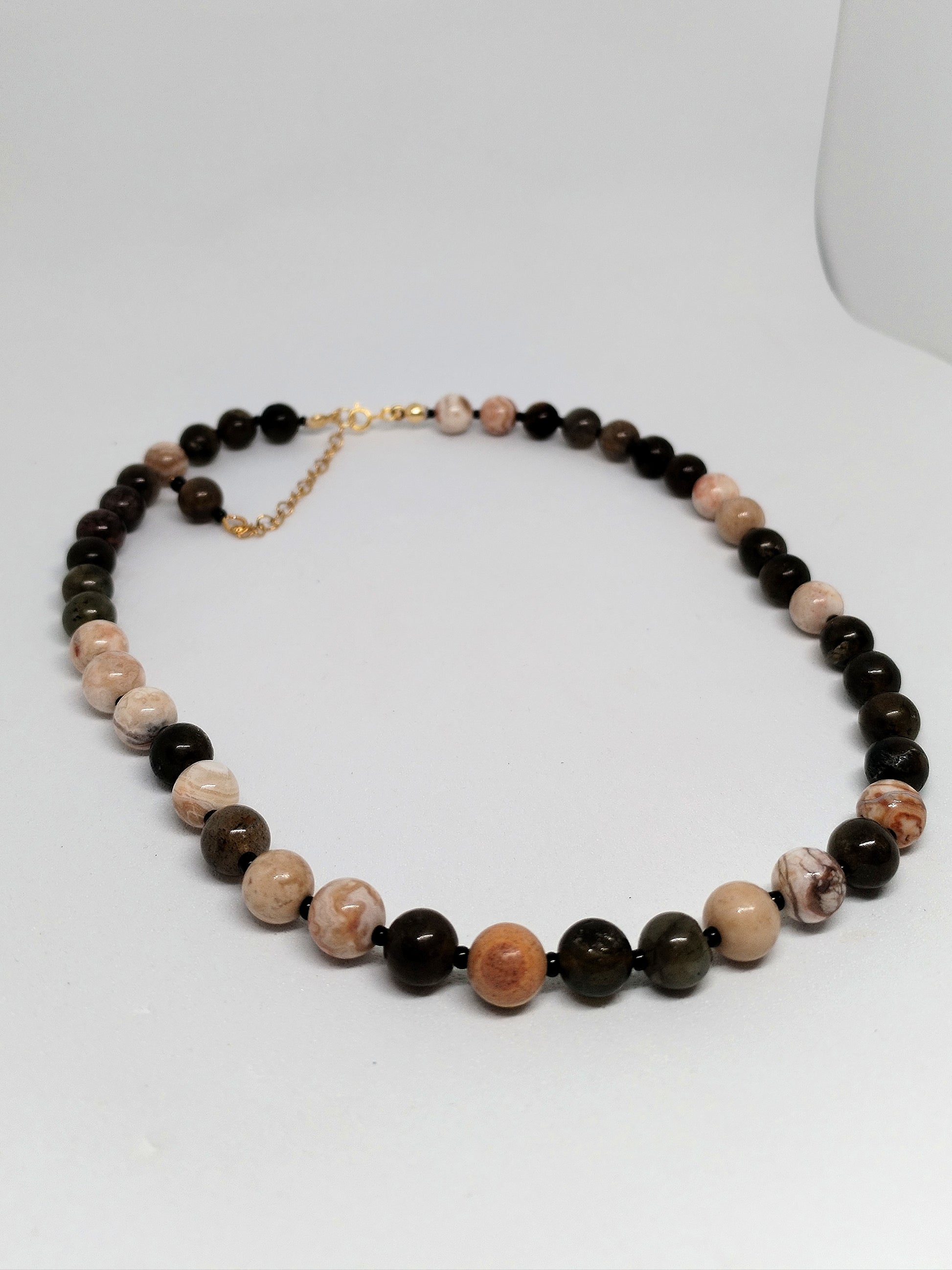 One of a kind handmade beaded necklace made using preloved beads in moss green, cream & browny tones with new black seed beads. Perfect for layering.