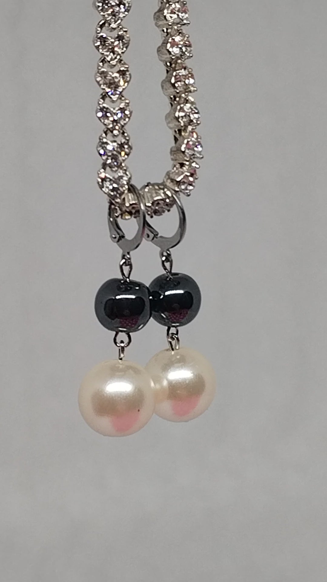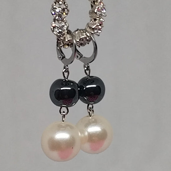 A beautiful, classy pair of reworked earrings handmade using vintage faux pearls & gunmetal grey beads on silver stainless steel huggie.