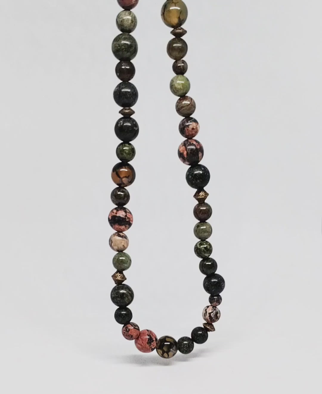 Beautiful handmade beaded necklace made using preloved unakite & dragon blood toned jasper beads with antique brass spacer beads. Unakite provides self love & jasper courage. Gold plated lobster clasp. Completely unique and one of a kind ✨